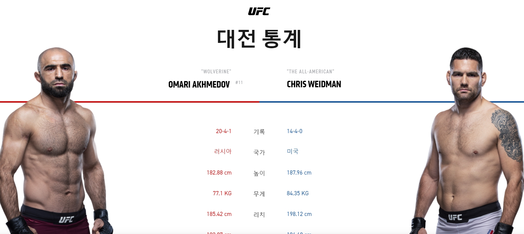 러시아의 떠오르는 별인 오마리 아크메도프는 7연승을 기대하고 있고, 크리스 와이드먼은 ufc 미들급에서 챔피언을 한 바 있습니다. 와이드먼은 최근 6시합에서 5피니시 패를 한 전적이 있어서 기운이 그리 좋지 않습니다. 많은 신인 선수들이 챔피언 후보로 거론되더라도 시합이 진행되면 후보의 명성에 맞지 않게 지기도 하므로 결과는 본 경기에서 확인해 봐야 하겠습니다.아크메도프는 20승 4패 1무, 와이드먼은 14승 4패 전적이 있습니다.