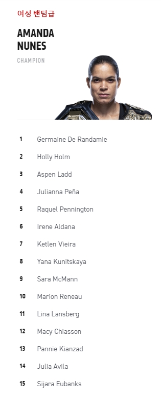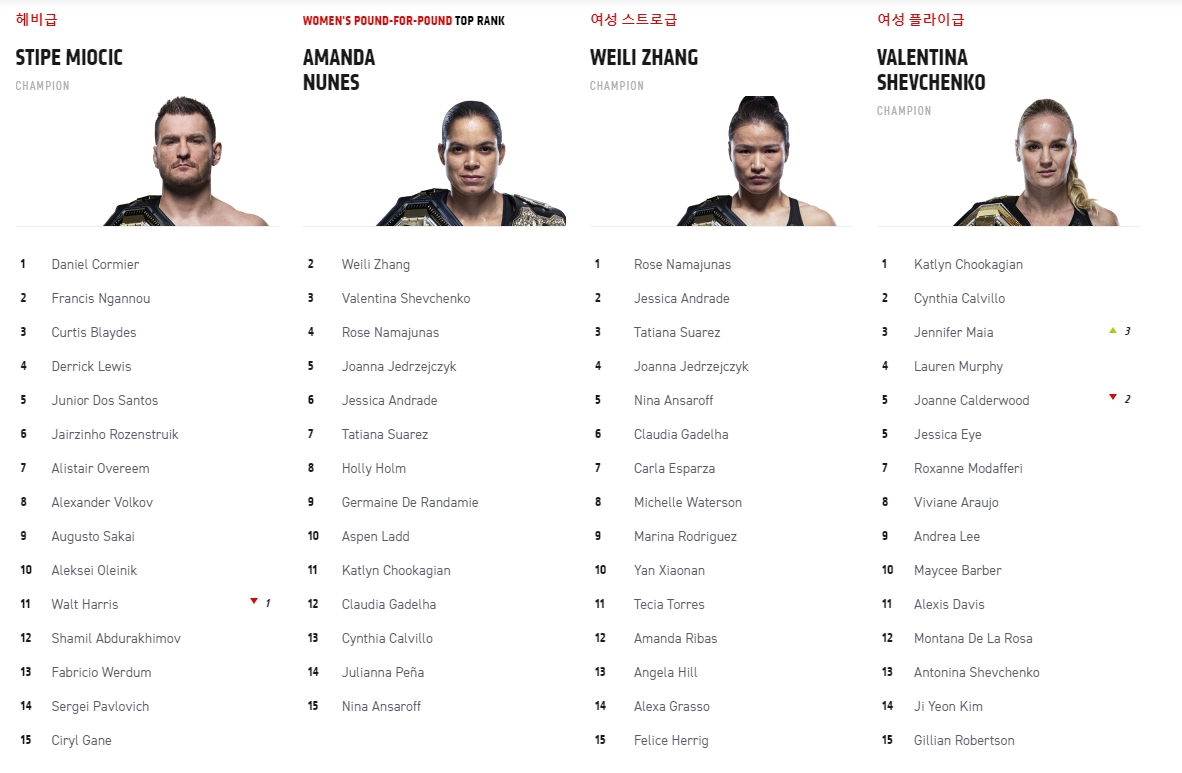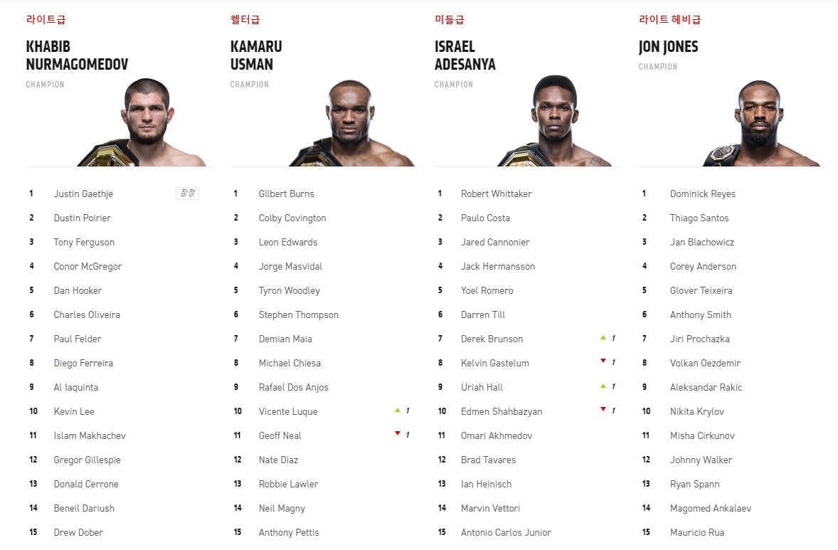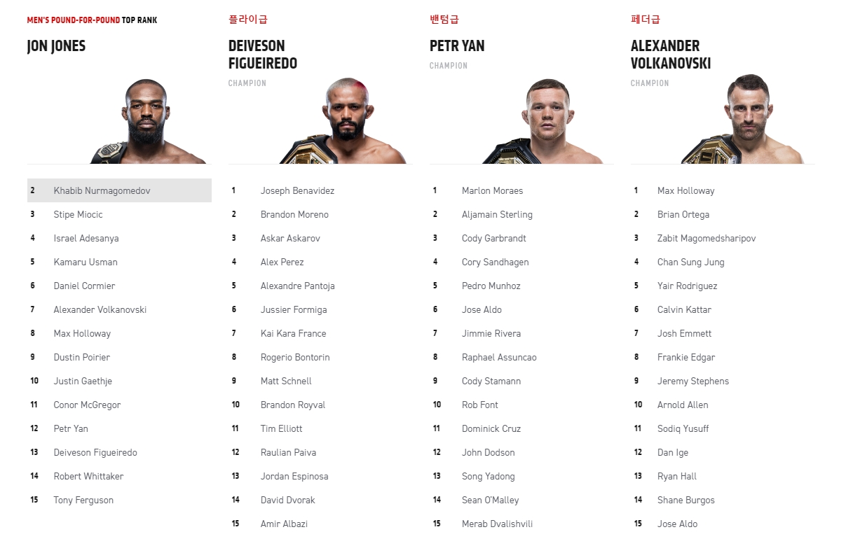 현재 UFC 랭킹 탑 랭크 15 선수로는 존 존스, 하빕 누르마고메도프, 스티페 미오치치, 이스라엘 아데산야, 카마루 우스만, 다니엘 코미어, 알렉산더 볼카노프스키, 맥스 할러웨이, 더스틴 포이리에, 저스틴 게이치, 코너 맥그리거, 페트르 얀, 데이브손 피게이레두, 로버트 휘태커, 토니 퍼거슨이 있습니다.